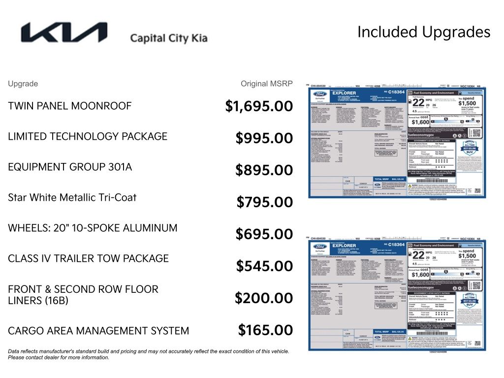 The interior of this Explorer is a true sanctuary, featuring premium leather-trimmed, heated, and ventilated captain's chairs that provide unparalleled comfort. The 10.1-inch touchscreen display with the advanced SYNC 3 infotainment system puts a world of connectivity and entertainment at your fingertips. Enjoy the convenience of a hands-free liftgate, a panoramic twin-panel moonroof, and a 980-watt premium audio system that will immerse you in your favorite music.