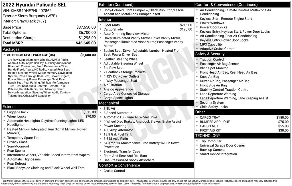 Step into the 2022 Hyundai Palisade SEL and youâll discover an SUV that doesnât just check the boxesâ"it redefines them. With room for seven people, heated front seats, and captainâsâ'chairs in the second row (for that feeling of first class even on road trips), this is where comfort meets capability. Add in a 3.8L V6 with 291 horsepower, smooth eightâ'speed automatic transmission, and optional allâ'wheel drive, and youâve got serious muscle under your control.