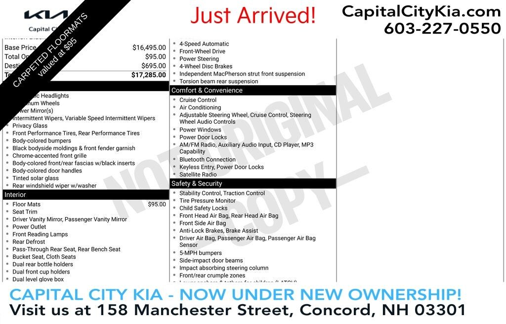 A versatile hatchback seating as many as 5 occupants with ease! Kia infused the interior with top shelf amenities, such as: a rear window wiper, front bucket seats, and air conditioning. It features a front-wheel-drive platform, an automatic transmission, and a 2 liter 4 cylinder engine.