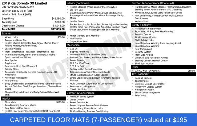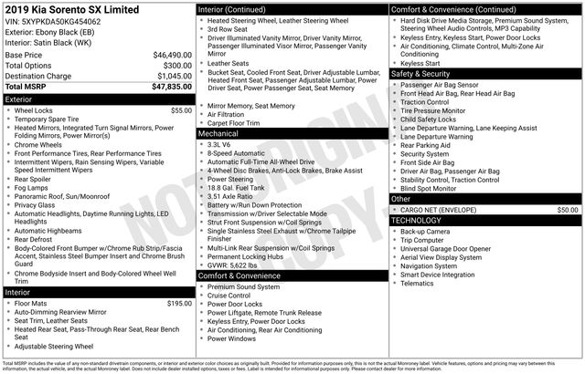 Discover the perfect balance of style, power, and convenience in the 2019 Kia Sorento SX Limited. This impressive SUV boasts a stunning Black exterior that commands attention on the road. Under the hood, the V6 engine and 8-speed automatic transmission with All-Wheel Drive deliver an exceptional driving experience, offering an impressive 19 city/24 highway MPG.