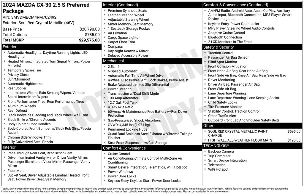 Overall, the 2024 Mazda CXâ'30 2.5â¯S Preferred AWD gives you an appealing blend of performance, refinement, safety, and warranty protection â" backed by the support and confidence of buying from a reputable dealership like Capital City Kia.