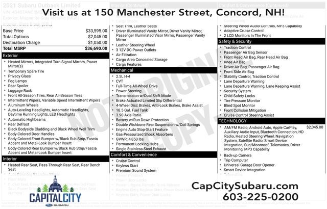 Discover the freedom and confidence that comes with owning the 2021 Subaru Outback Limited. Visit us today at 150 Manchester St Concord NH, 03301 or call us at (603)225-0200 to experience this exceptional vehicle for yourself. Family owned & operated, with lifetime New Hampshire State Inspections and complimentary service loaner fleet included with your purchase.