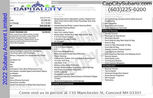 Slip into the luxurious, spacious cabin and experience the unparalleled comfort of the Ascent Limited. Heated front and rear seats, a dual-zone automatic climate control system, and a panoramic moonroof create a serene, relaxing environment for you and your passengers. The Subaru STARLINK 8.0" Multimedia Navigation System with a high-resolution display and smartphone integration keeps you connected and entertained, while the premium harman/kardon audio system immerses you in concert-quality sound.