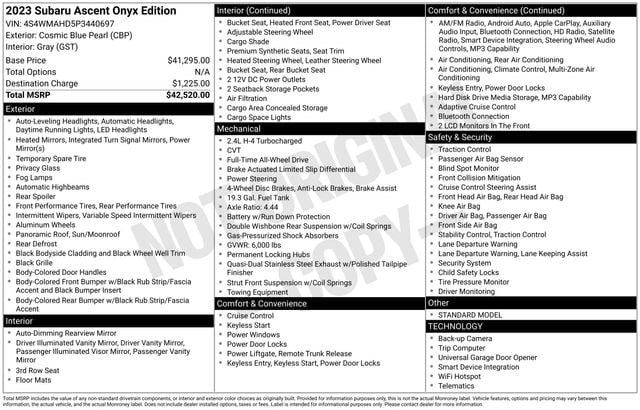 Experience the perfect blend of capability, comfort, and technology in the 2023 Subaru Ascent Onyx Edition. With an MSRP of $29,600, this exceptional SUV offers unbeatable value. Visit our showroom today and discover the difference that the Ascent Onyx Edition can make in your driving experience.
