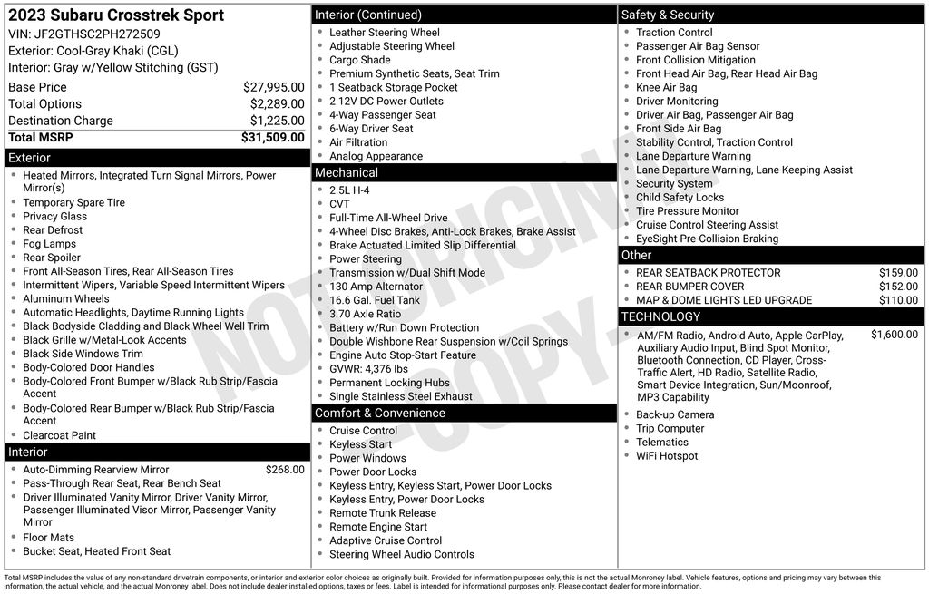 The 2023 Subaru Crosstrek Sport is the perfect blend of adventure-ready performance and everyday practicality. Powered by a 2.5L engine with 182 hp, itâs equipped to take on both city streets and rugged trails with standard AWD. The Sport trim adds a bold design, with 17-inch alloy wheels, roof rails, and a larger touchscreen with Apple CarPlay and Android Auto. Plus, Subaruâs EyeSight Driver Assist Technology keeps you safe on every journey. Whether you're commuting or exploring, the Crosstrek Sport is ready for your next adventure.