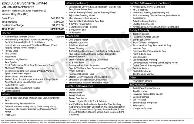 The 2023 Subaru Solterra Limited is more than just a vehicle â" it's a statement of your commitment to sustainability and a glimpse into the future of transportation. Experience the thrill of electric driving and the reliability of Subaru engineering by visiting us today.