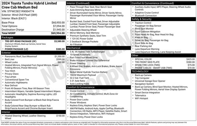 Powered by a 3.4L V6 hybrid engine and a smooth 10-speed automatic transmission, the Tundra Hybrid Limited delivers an impressive 19 city/22 highway MPG, making it a true standout in its class. The TRD off-road suspension and electronic rear differential lock provide unrivaled capability, ensuring you can tackle any terrain with confidence.